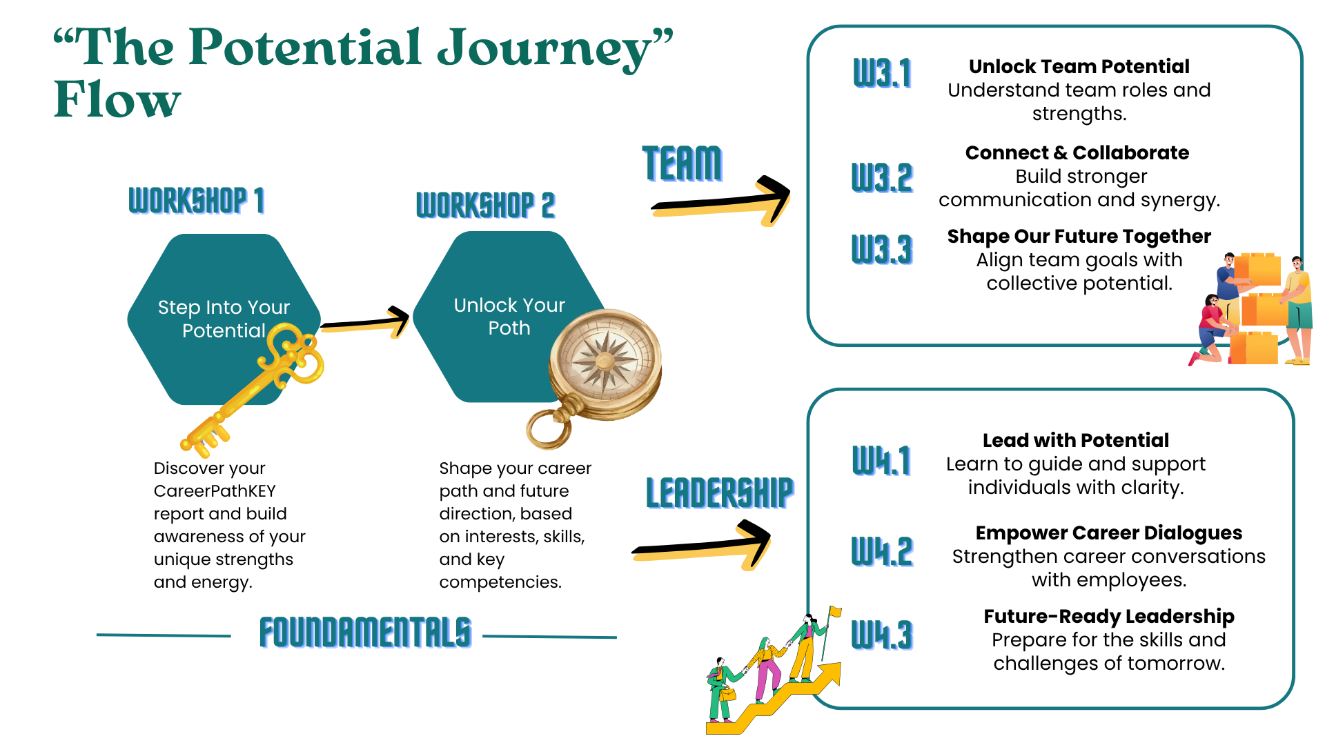 The Potential Journey is a corporate development pathway that helps organizations unlock the full potential of their people — from individual awareness to team synergy and leadership excellence.